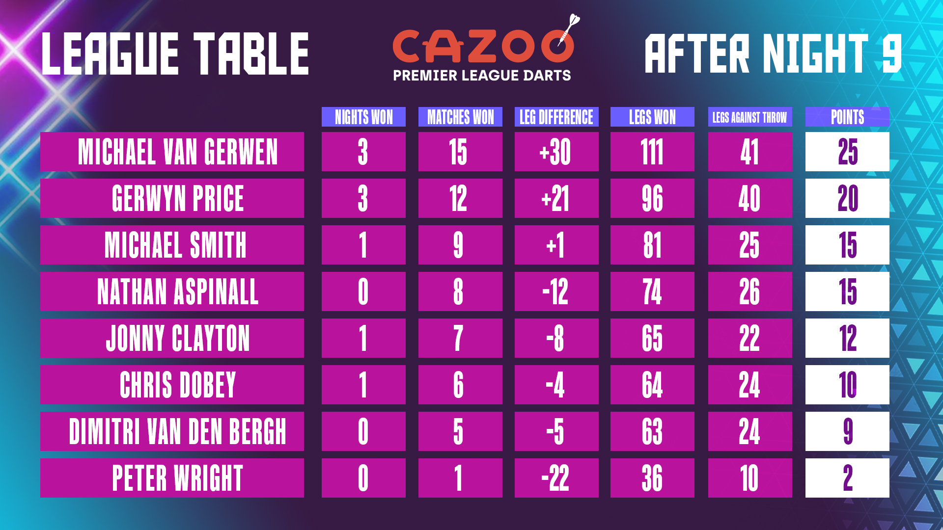 Welšan v prvom kole v dramatickom súboji porazil Michaela van Gerwena 6:5, hoci prehrával 4:5. V druhom kole narazil na svojho krajana Gerwyna Pricea, ktorému v prvom kole moc nevzdoroval trápiaci sa Peter Wright. Snakebite v tejto sezóne Premier League vyhral jediný zápas. Fantasticky zahral Nathan Aspinall, ktorý v najlepšom zápase prvého kola porazil Chrisa Dobeyho a van den Bergh v najhoršom výkone večera zase podľahol Michaelovi Smithovi.